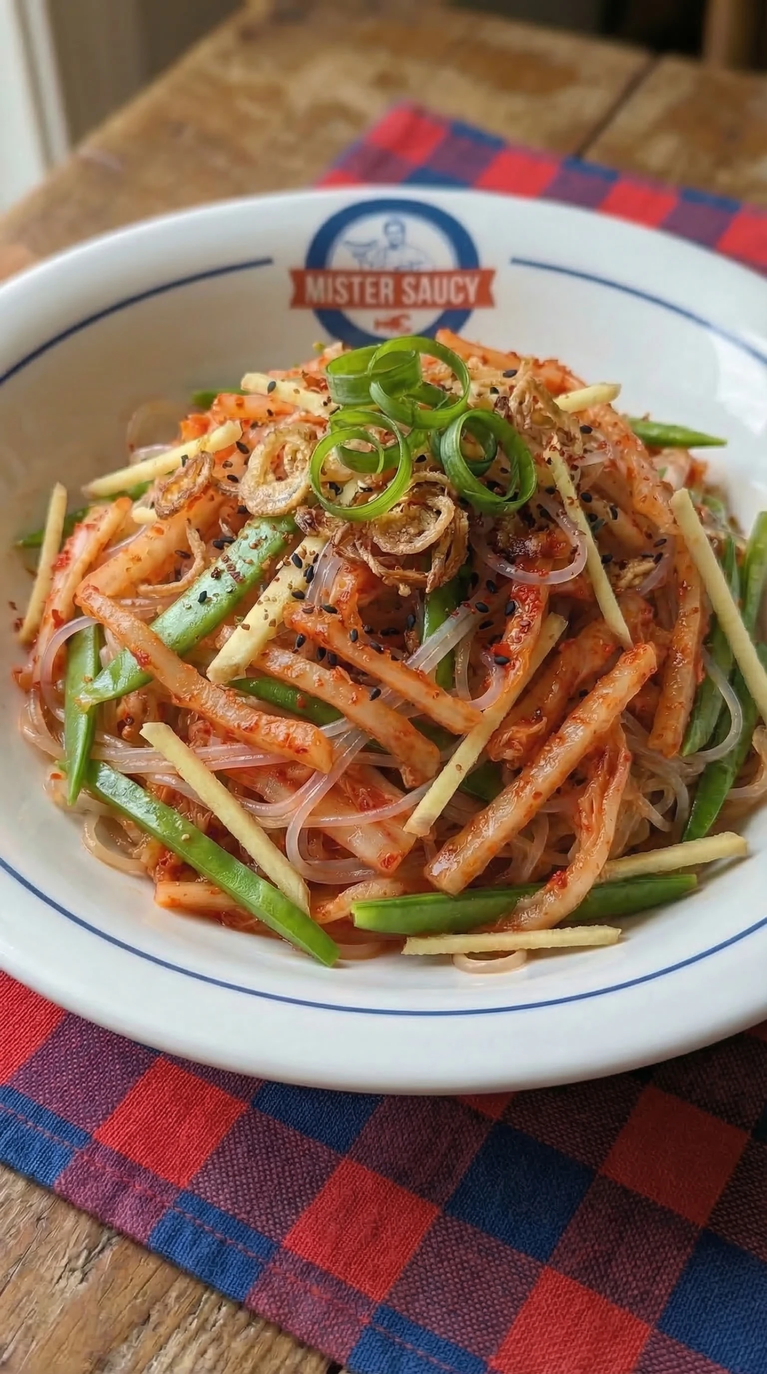 Salade de kimchi julienné et nouilles transparentes à la vinaigrette gingembre-sirop